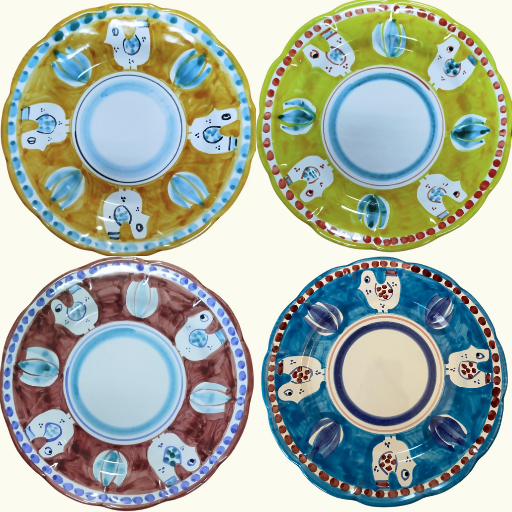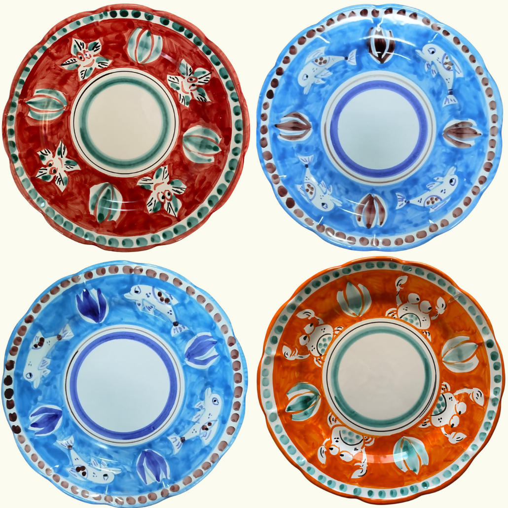 Assiettes en céramique italiennes peintes à la main à Vietri-sul-Mare, fabriquées directement à la commande. Toutes les combinaisons de couleurs sont possibles pour votre lot. Merci donc d'indiquer votre choix de motifs à l'adresse boujour@amphitria.com juste après votre commande !