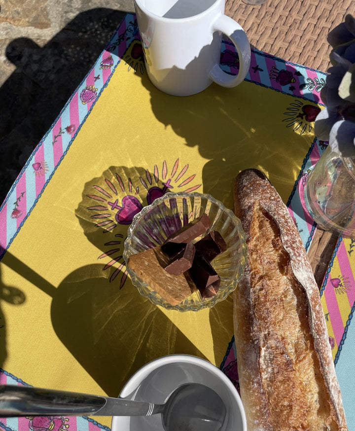 • Motif : Cœur sacré - Fond uni jaune - Bordure rayée turquoise et rose - Motifs fleurs et abeilles