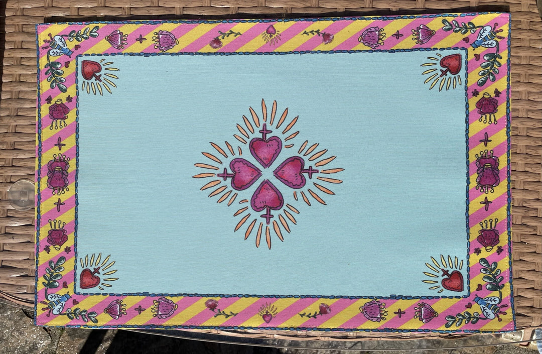 Sets de table - Tissu anti-tâches - Motifs cœur sacré - Fond uni turquoise