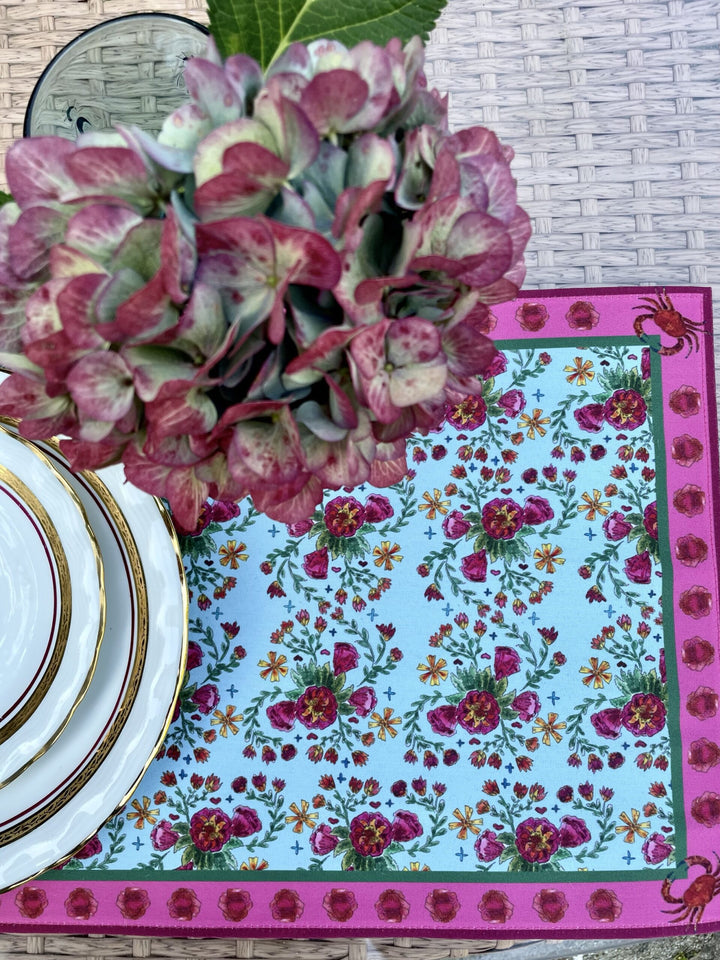 Sets de table - Tissu anti-tâches - Motifs fleurs - Fond uni turquoise